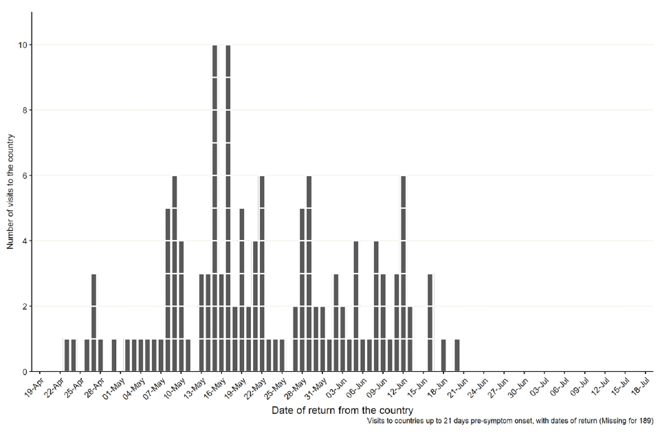 Figure 6. Cases with reported foreign travel within the 21 days prior to symptom onset as of 20 July 2022