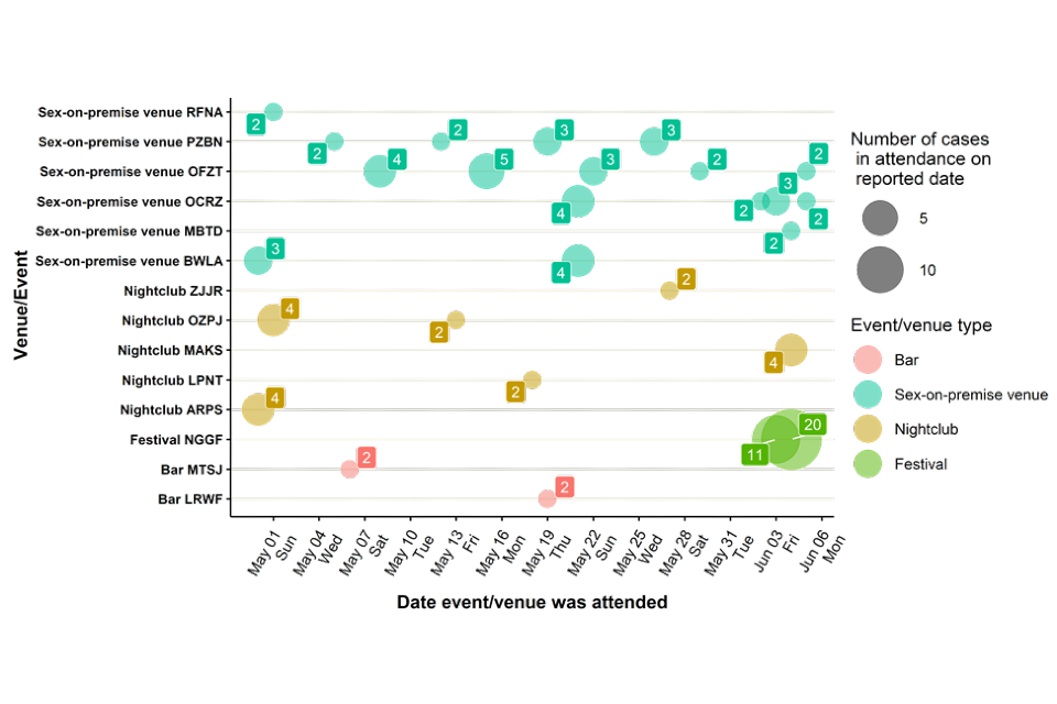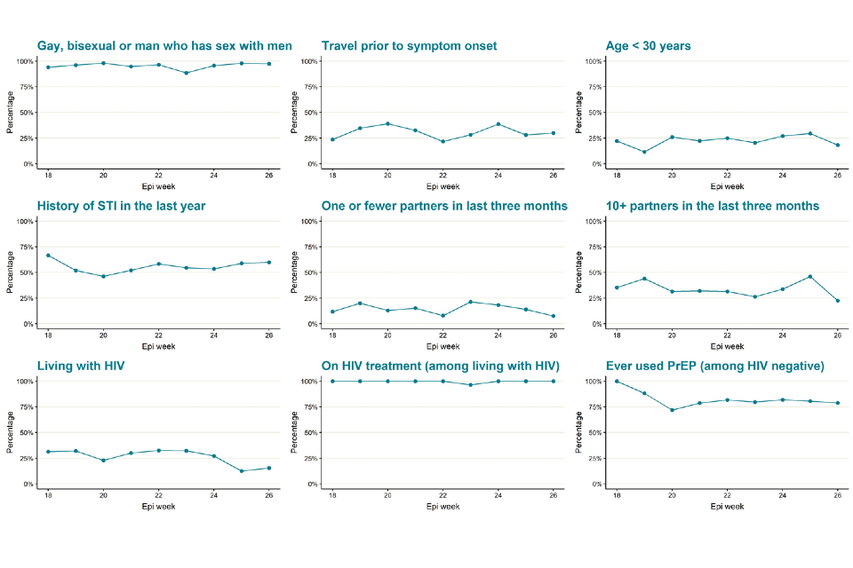 Of the 2,070 cases identified in England up to 20 July 2022, a total of 576 (28%) had enhanced surveillance questionnaires. This includes data collected via rapid sexual health questionnaires administered during the initial weeks of the outbreak (used from 27 to 31 May 2022), questionnaires completed by health protection teams during telephone interviews (used from 1 to 24 June 2022), and self-completed questionnaires sent electronically to cases (used from 25 June 2022 onwards). Information from enhanced questionnaires should be interpreted with caution, as this is available for less than 30% of cases. People completing questionnaires may not be representative of all those affected.