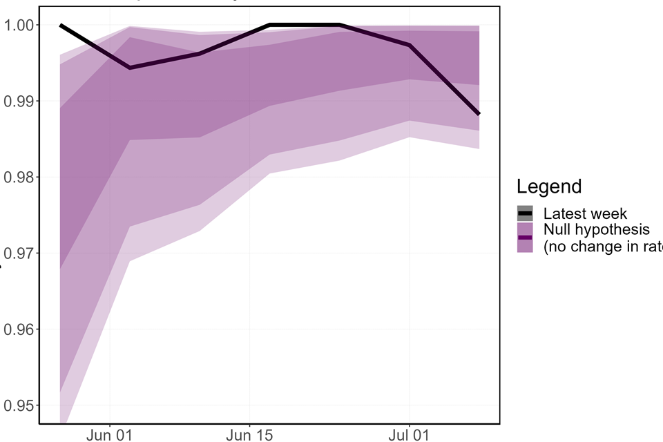 The purple shaded area is the null hypothesis (which implies no change in the rate). The solid black line is the proportion observed in the latest week, plotted by the first day of the focal week.