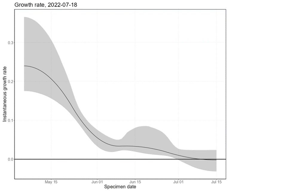 The nowcasting suggests that the growth in confirmed daily cases is around zero, but with very high uncertainty (Figure 10), with growth rates estimated between a 23-day doubling time and a 24-day halving time. Negative doubling times represent halving times. A 24-day halving time is consistent with the epidemic shrinking. The swathe that spans zero shows growth has slowed and may now be close to zero.