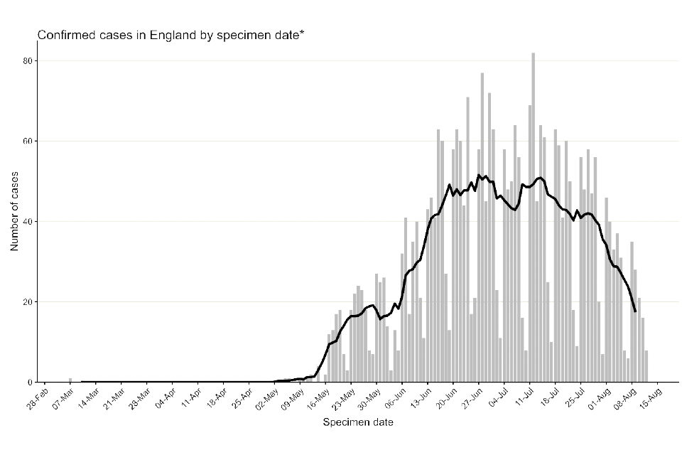 Figure 1 shows the specimen dates of monkeypox cases over time in England, from the first positive sample taken on 7 March 2022. As reported in technical briefing 5, this case was identified in late July 2022 through retrospective testing of a residual sample; however, the first reported case in England was identified 6 May 2022 in a traveller from an endemic country for monkeypox. An additional small number of cases have also been detected with specimen dates in May 2022 but with symptom onset dates in early April 2022. Some of these early cases had no travel history in their incubation period.