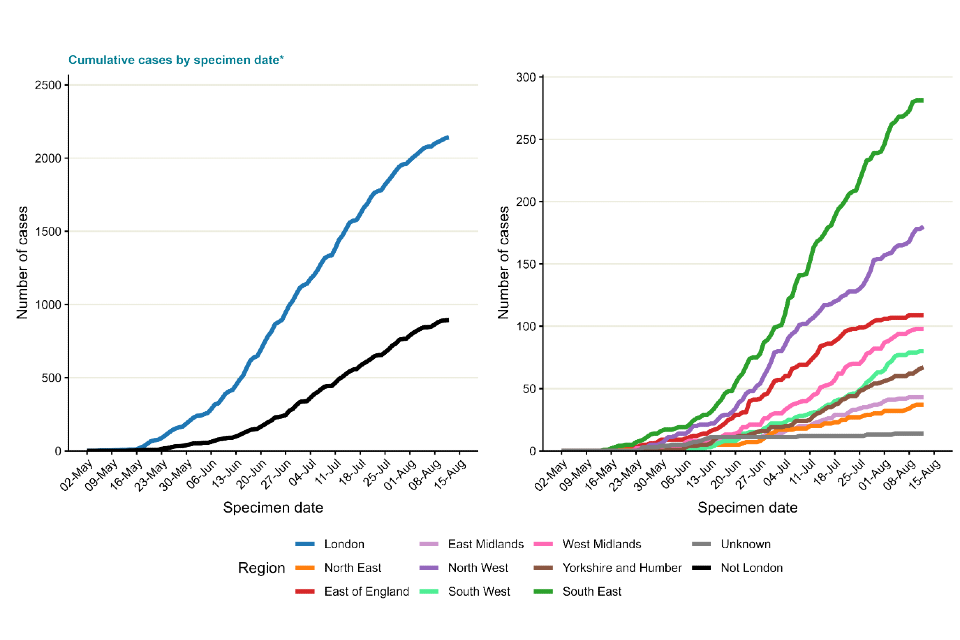 In England, a high proportion of cases were known to be London residents (overall 71%, 2,141 out of 3,035 with reported home address), see Table 2. The number of cases in other regions has been steadily increasing, particularly in the South East and North West of England (Figure 2). Accordingly, the proportion of cases in London has declined over time, to approximately 58% in August to date (Figure 3).