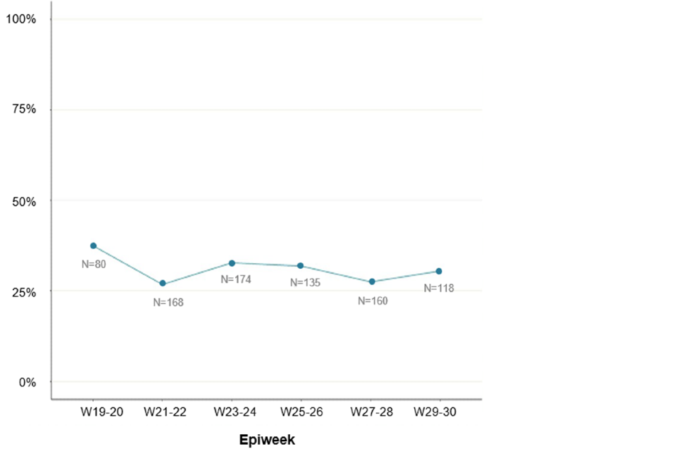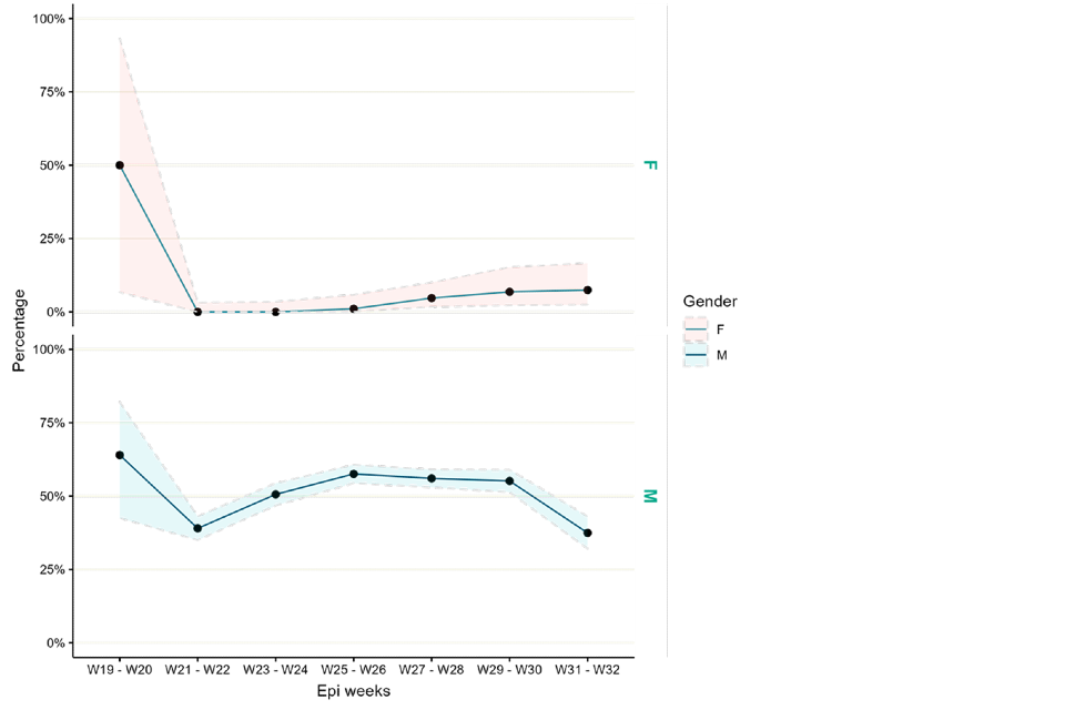 Figure 7 shows positivity by sex. Positivity in females is low but has increased slightly in recent weeks (based on small numbers in each time period), whereas positivity in males was higher between weeks 25 and 28, but more recently has decreased to below 40%. This may align with decreasing case numbers over time but may not reflect total positivity trends across all laboratories.