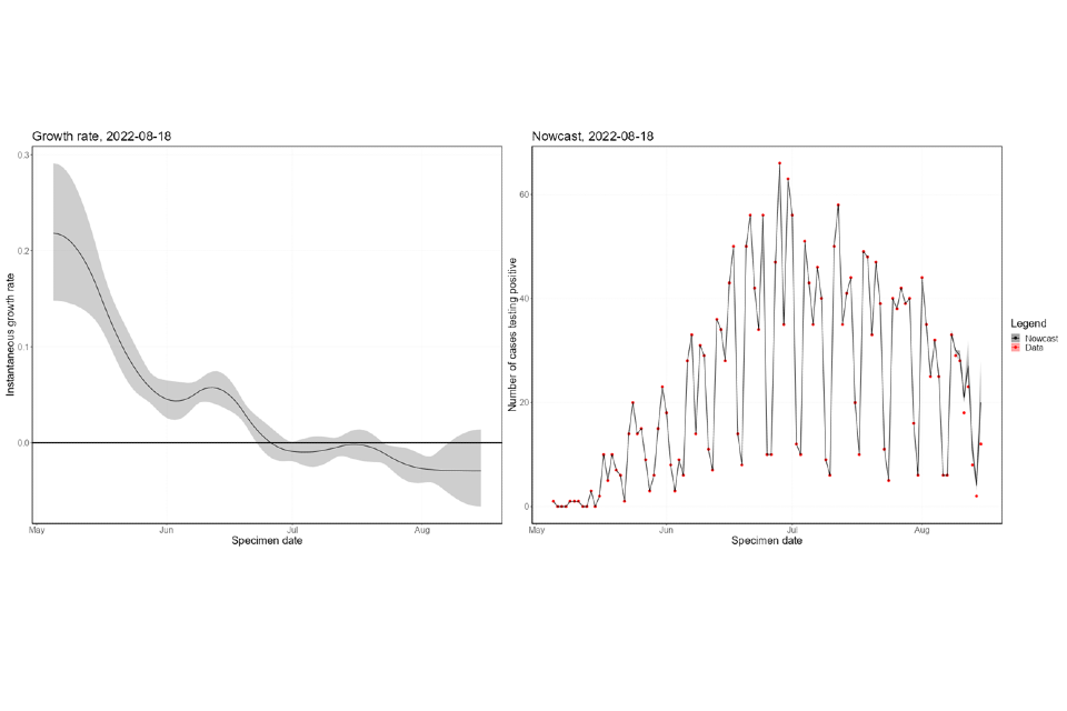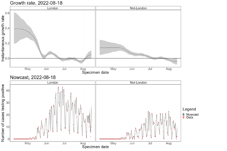 Nowcasting by both specimen date and reporting date continues to indicate and declining epidemic. However, there is a difference for cases outside of London, where the indication is zero growth.