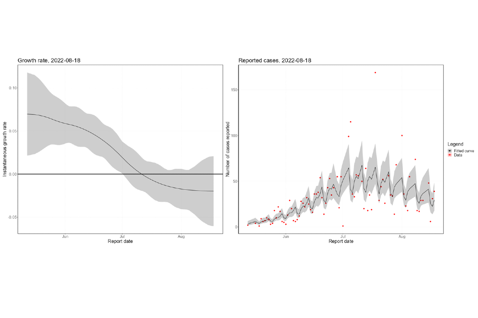 Figure 8. Nowcast growth rate and incidence of monkeypox cases in England. 8a shows estimates by specimen date, 8b shows estimates by report date