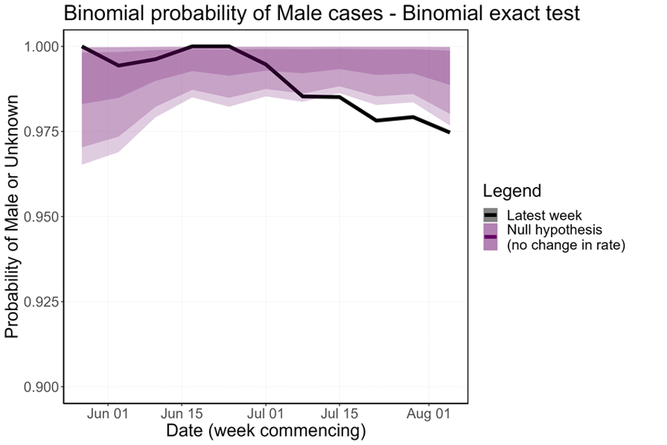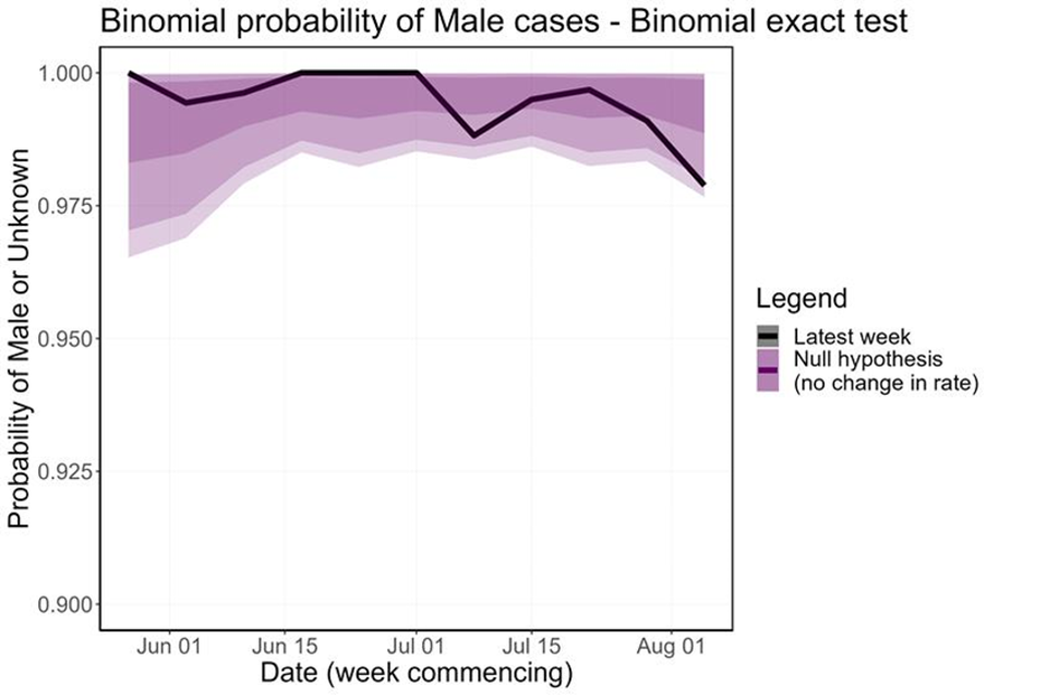 To assess the evidence, we construct a null hypothesis of no change in the transmission network based on the gender-distribution of cases before July. We then adjust this observed proportion to the number of cases in the current week, to create a 95% confidence region where we would expect the currently observed gender-distribution to lie if it follows the null hypothesis. By overlaying the currently observed gender-distribution, we can identify statistically significant perturbations. Note that although statistically significant, these perturbations may not reflect underlying transmission changes, since it could also be affected by changes in the relative ascertainment of cases in women relative to men, or unknown cases. We plot the statistical test as a rolling function of time for each week of the outbreak.