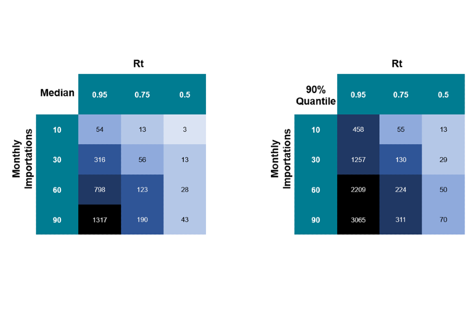 Simulations can help us understand the contribution importations may be making to the overall picture in the UK. To better understand the contribution of importations, we have run simulations of imported-infection outbreaks, using different assumptions about reproduction number (Rt) and the number of imports, to show what reasonable numbers of autochthonous infections we may expect to see.