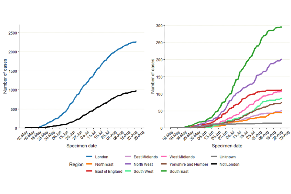 Figure 2. Cumulative count of confirmed and highly probable monkeypox cases by region of residence in England as of 26 August 2022*