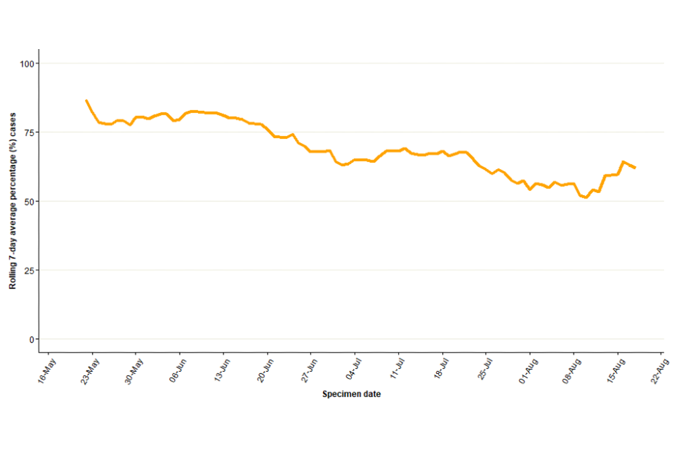 Figure 3. Seven-day rolling average of the percentage of confirmed and highly probable monkeypox cases in London, by specimen date as of 26 August 2022