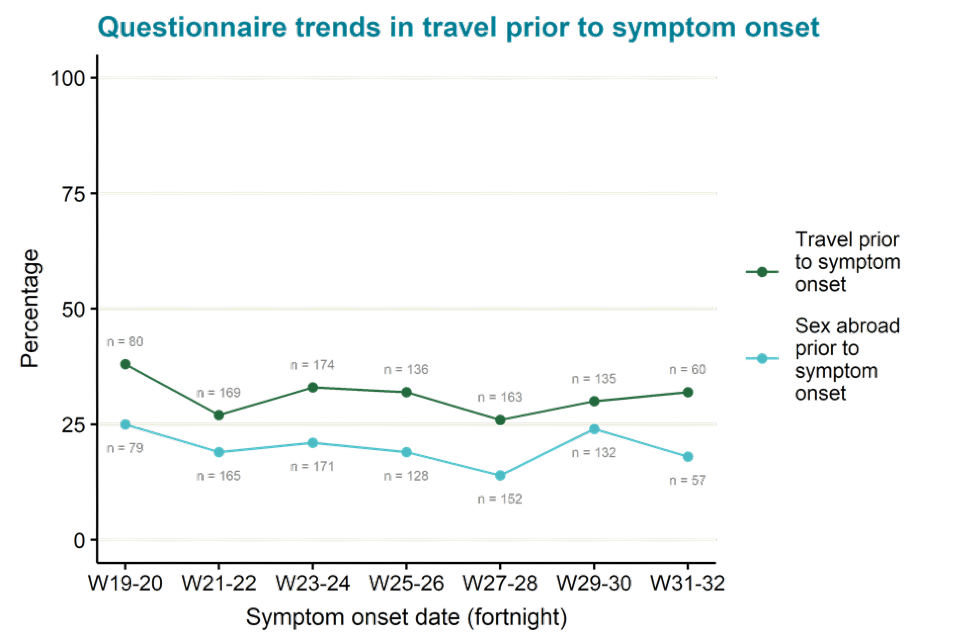 Questionnaire data alone is used for estimating proportions of cases that have travelled, as ascertainment of travel information among all cases has changed over time. As of 26 August 2022, 30% of 963 questionnaire respondents reported travel in the 21 days prior to symptom onset. Among 928 respondents who provided information about sexual activity abroad, 19% (n=180) reported sex abroad. This may mean acquisition abroad was more likely though it is not confirmed.
