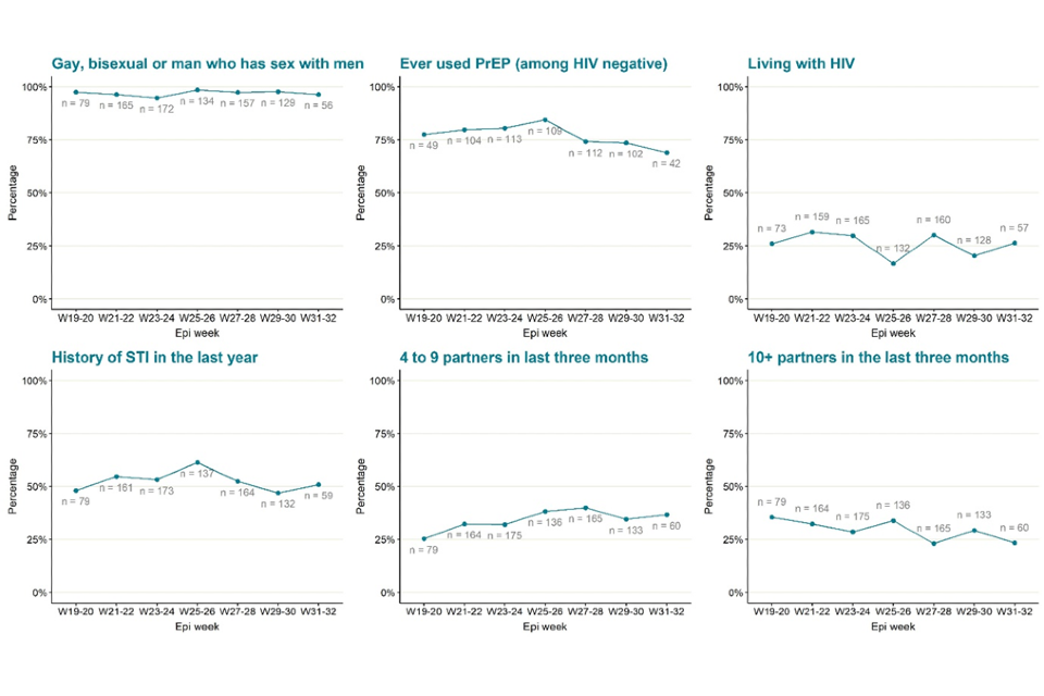 Figure 6. Trends of selected epidemiological metrics in monkeypox cases with completed questionnaires, by week of symptom onset in England, epidemiological weeks 19 to 32 (8 May 2022 to 13 August 2022)