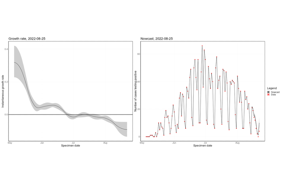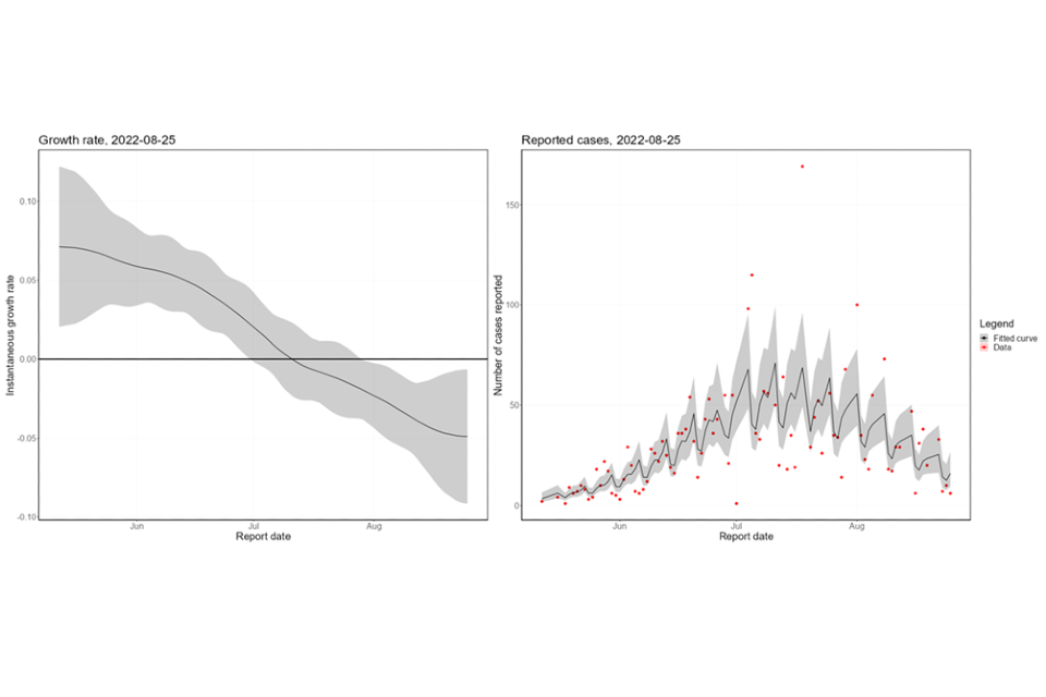 The nowcasting using models described in previous technical briefings suggests that the growth in confirmed daily cases is negative (Figure 7). The nowcast estimate of non-travel cases is around 10 per day. The epidemic inside London has declined since mid-July 2022 (Figure 8), with the epidemic outside of London declining since early August 2022.