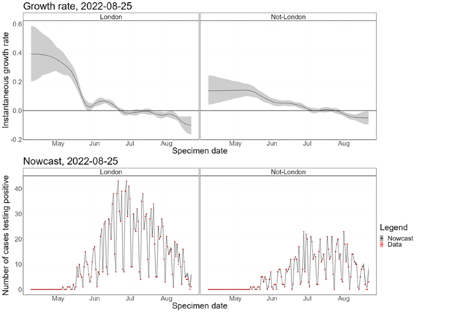 Figure 8. Estimates of nowcast growth rate and incidence by specimen date inside and outside London