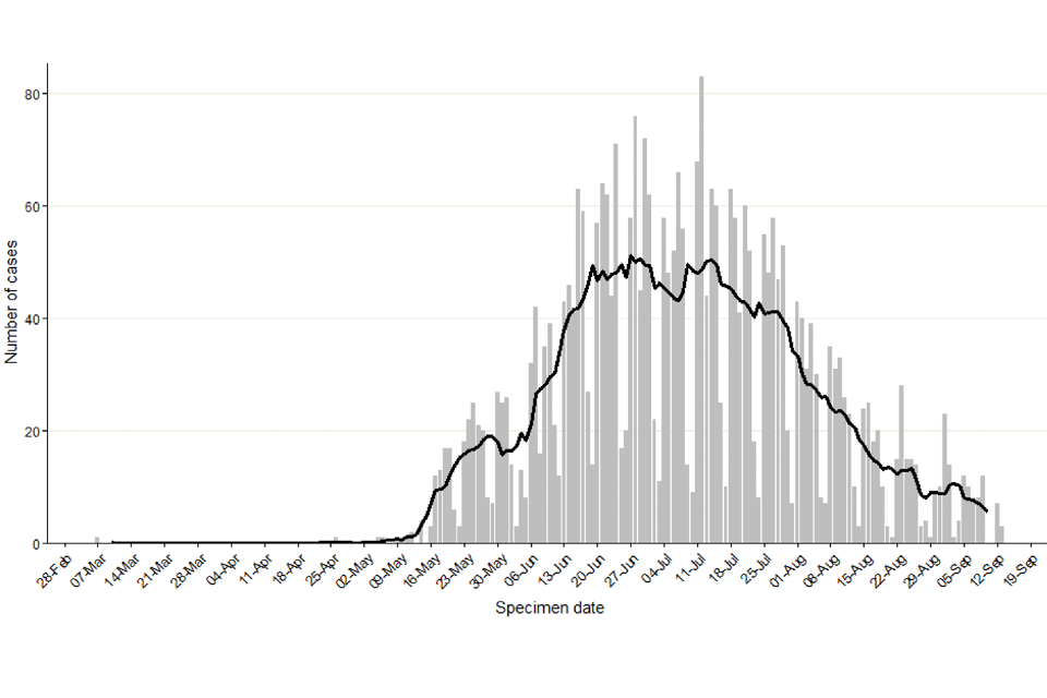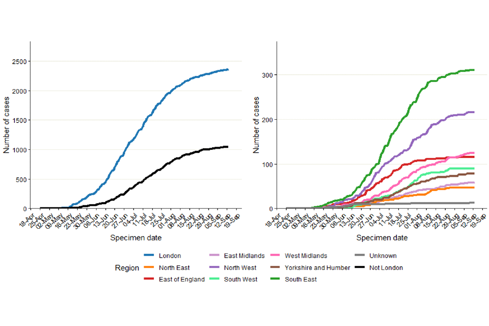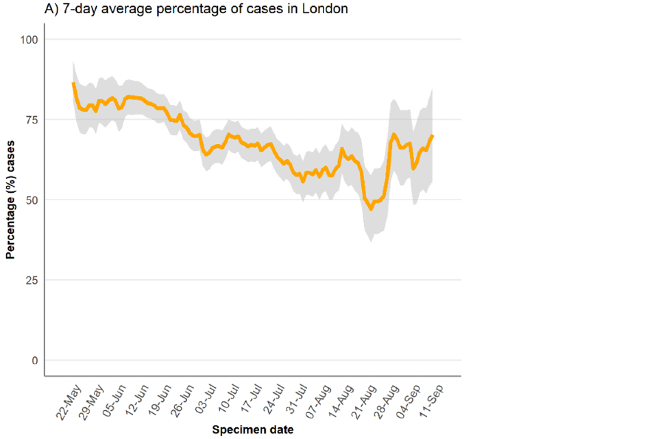 The proportion of new cases which are in London has decreased from 80% at the start of the outbreak to 50% in mid-August, but has increased again more recently suggesting the slow-down in cases has been more prominent outside London.