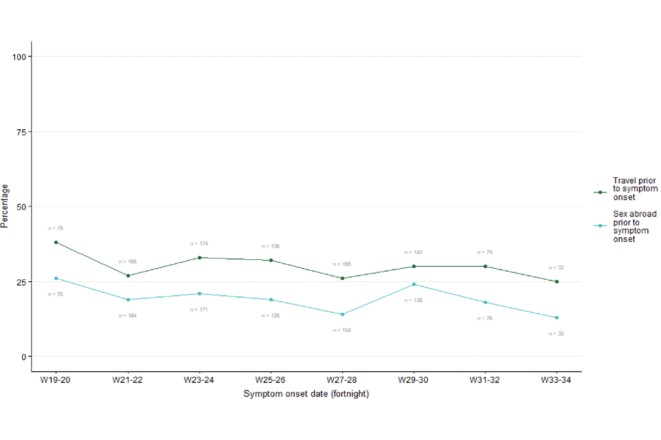 Questionnaire data alone is used for estimating proportions of cases that have travelled, as ascertainment of travel information among all cases has changed over time. As of 16 September 2022, 30% of 1,034 questionnaire respondents reported travel in the 21 days prior to symptom onset. Among 998 respondents who provided information about sexual activity abroad, 19% (n=190) reported sex abroad. This may mean acquisition abroad was more likely though it is not confirmed.