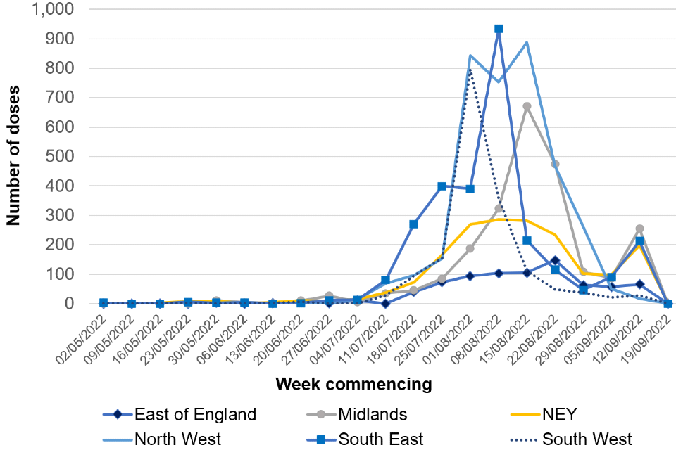 Table 2. Number of confirmed and highly probable monkeypox cases by region of residence, England, 6 May 2022 to 16 September 2022
