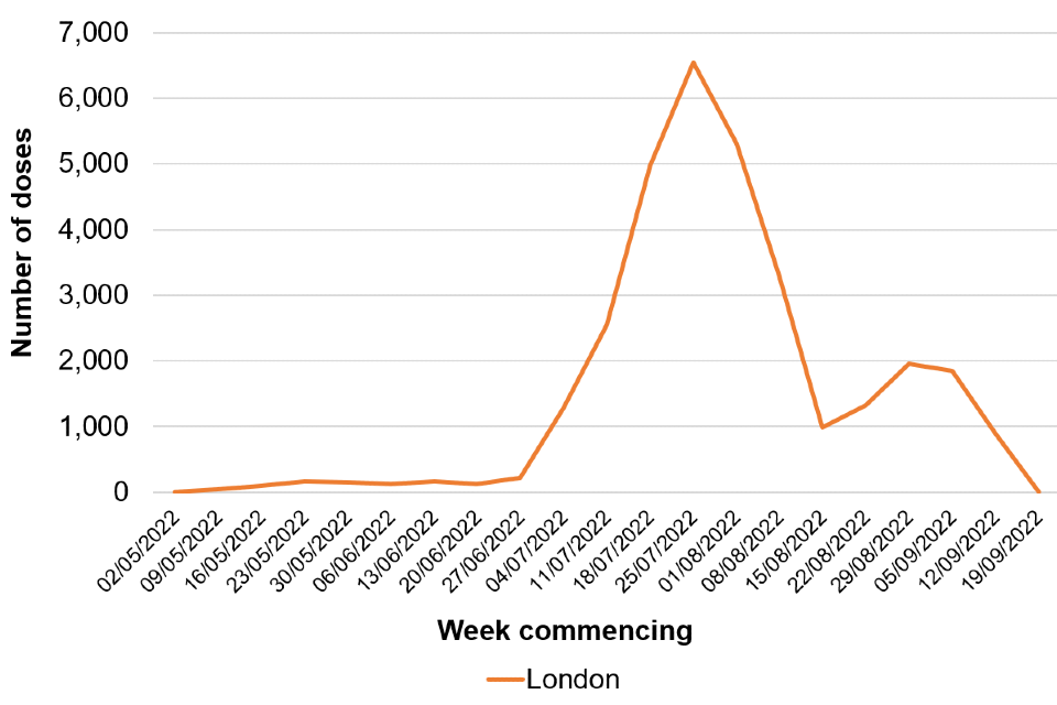 As of 16 September 2022, 69% of England cases were known to be London residents (2,359 out of 3,399 with reported home address) (Table 2). This percentage had decreased from more than 80% in May 2022 to 50% in mid-August 2022 (Figure 2) but has increased more recently suggesting the slow-down in cases has been more prominent outside London.