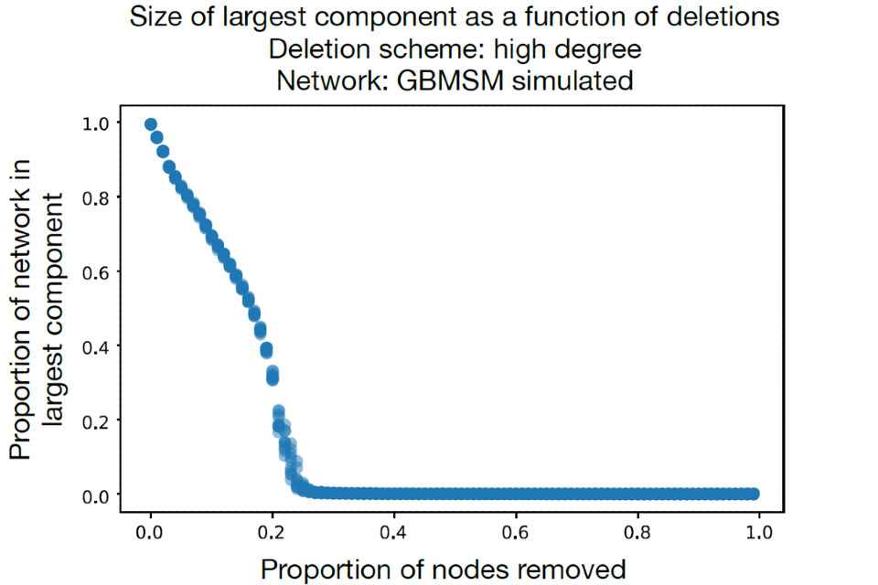Figure 12. The proportion of a network simulating GBMSM sexual contacts that remains within a largest component when high-degree nodes are iteratively deleted