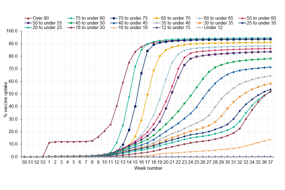 Figure 1: Percentage of people in England by age who received 2 doses of a COVID-19 vaccination by week ending 19 September 2021 (source: Public Health England).