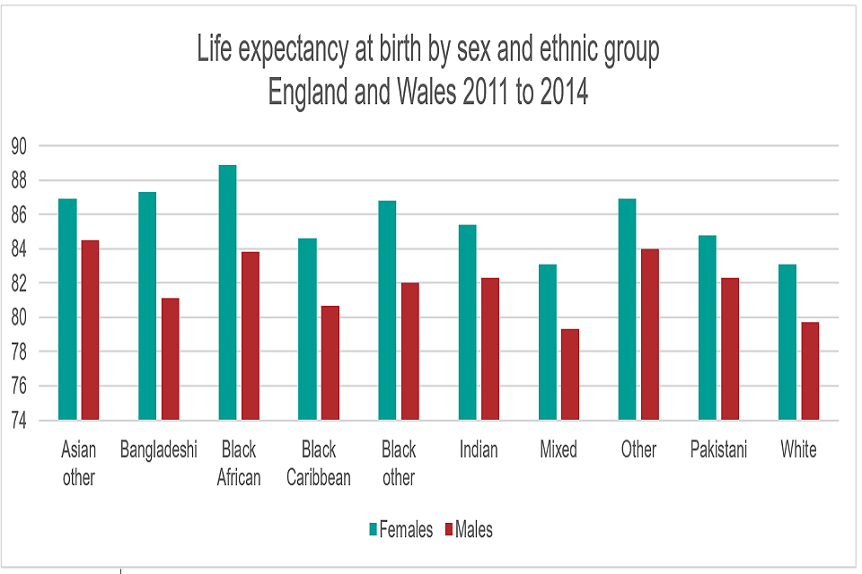 Figure 3: breakdown of different life expectancy at birth by sex and ethnic group in England and Wales 2011 to 2014.