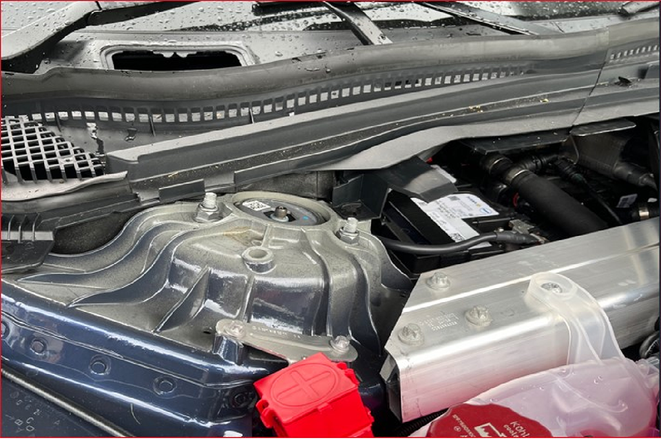 The bonnet is open and the trims have been removed to show the 12v battery.