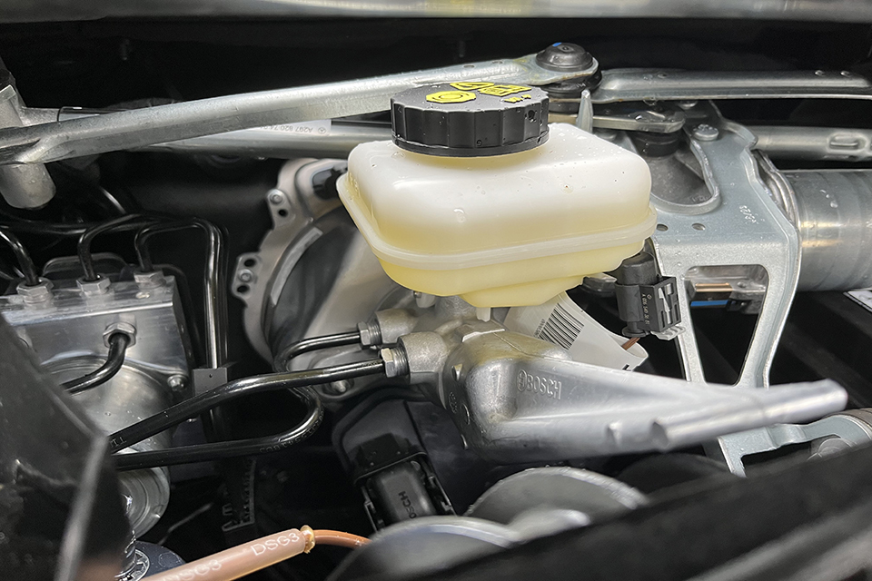 The bonnet is open and the trims have been removed to show the master cylinder and pump.