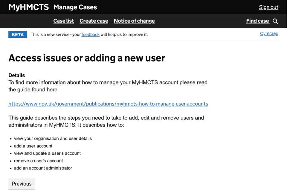 3. By selecting an option, you will find information that directs you to guidance or how to further progress your query. For example, if you select ‘Access issues or adding a new user’, you will be directed to where to find guidance on that subject. If this does not resolve your query, select ‘Previous’ to take you back to the options.