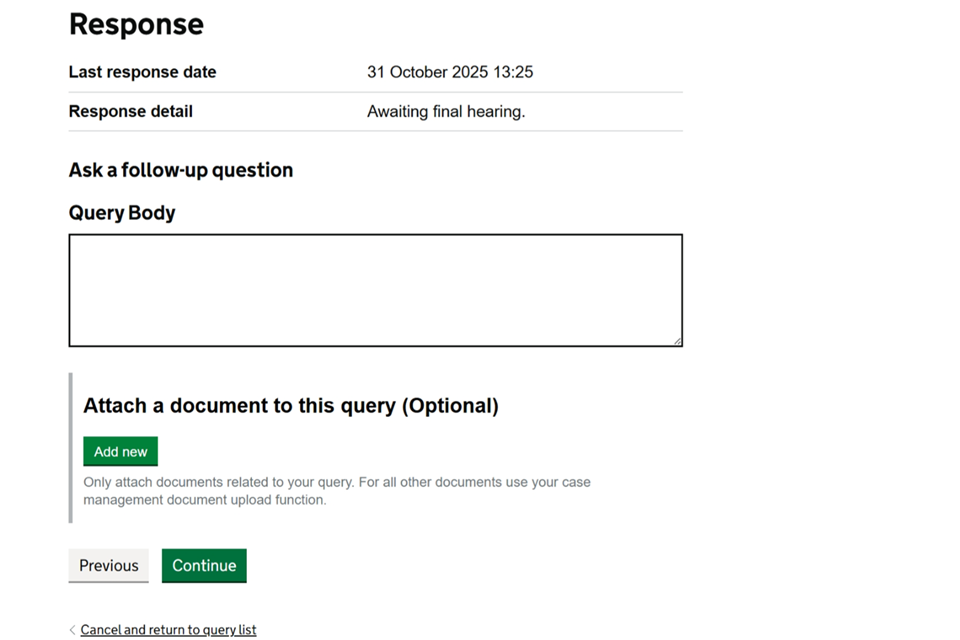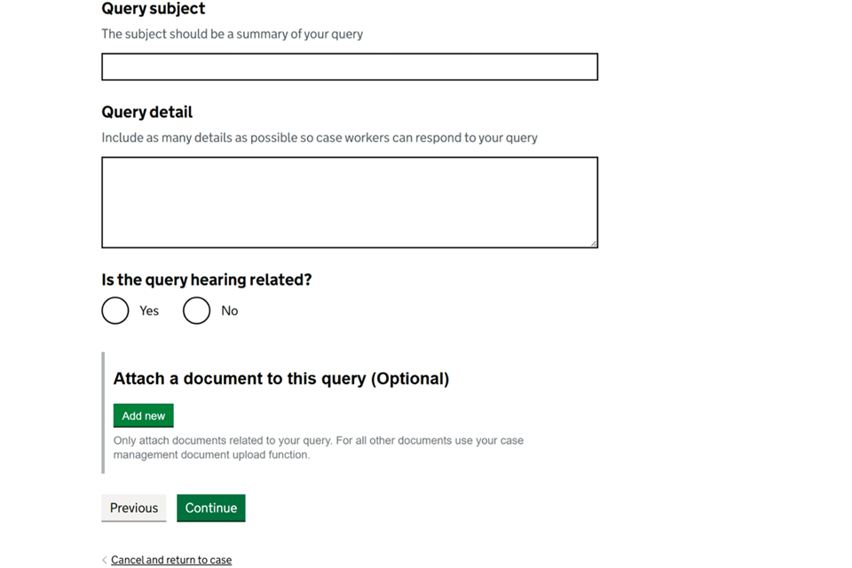 5. Enter a query subject and the details. Select if the query is related to a hearing. Upload any documents that support the query. Any documents you upload here will not be visible by the judge – they will only be seen by the admin team. You must upload any case related documents using the manage documents function.