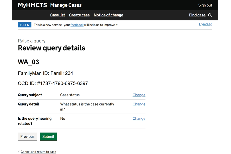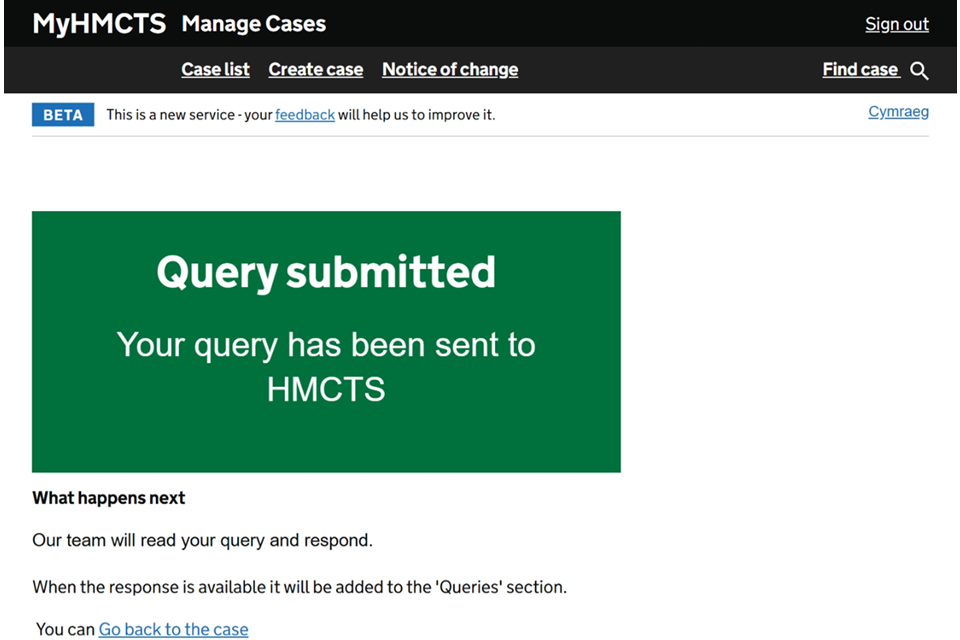 You can submit a query to the court and tribunal service centre (CTSC) using the ‘Raise a new query’ option when managing a case.