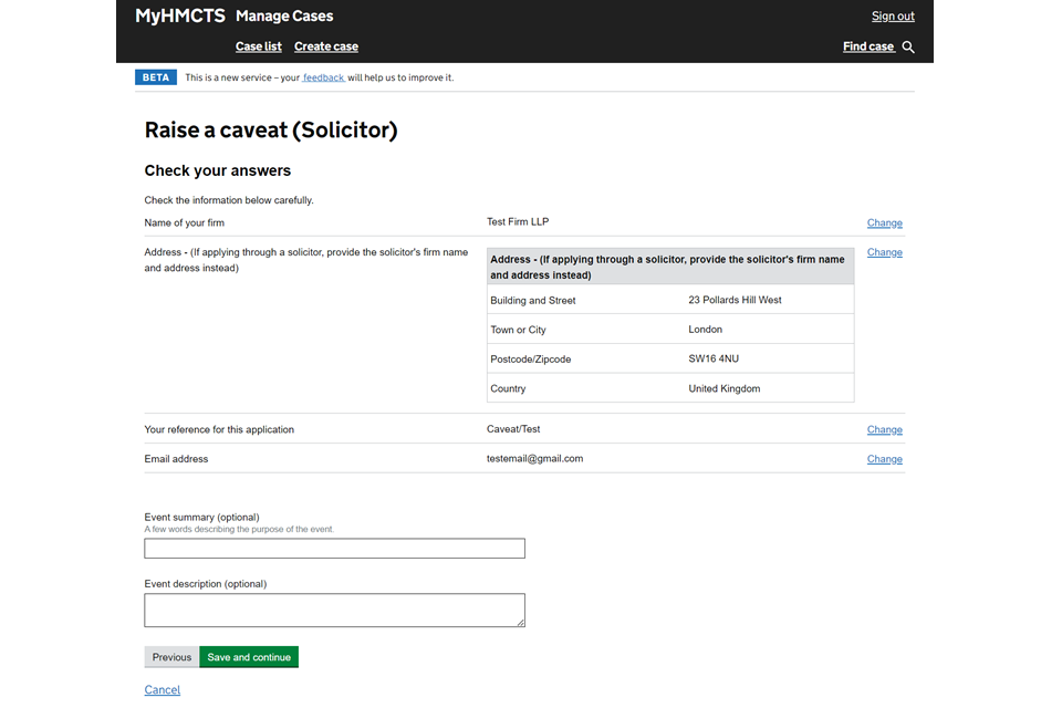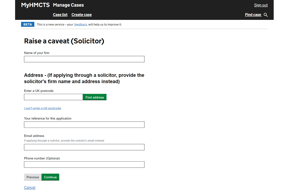 1. Add your organisation’s name and address, your caveat application reference and an appropriate email address. Then select ‘Continue’.