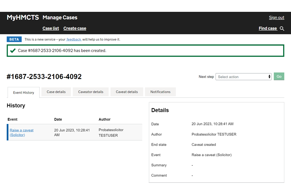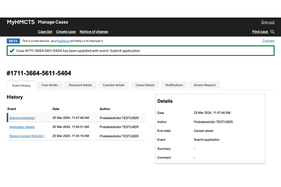 10. You will see a confirmation that the case has been updated with the event ‘Application details’.