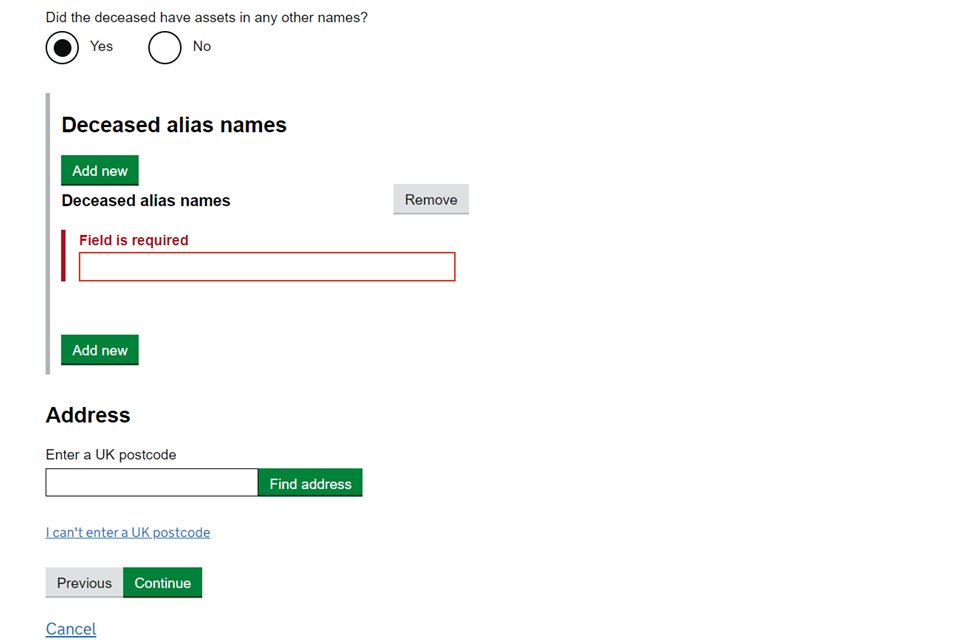 5. If the person who has died had assets in any other names, select ‘Yes’ and add their aliases by selecting ‘Add new’.