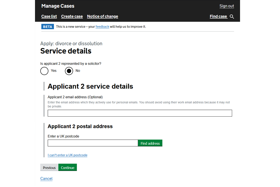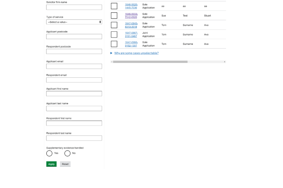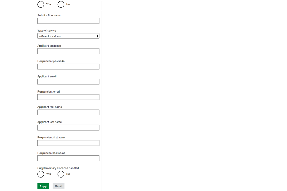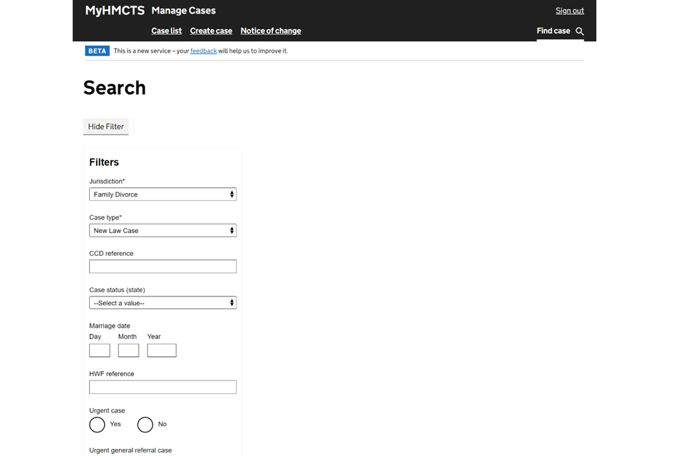 3. Within the search screen, you can type in details of a specific case such as the divorce case number, party names and solicitor reference to find a specific case.