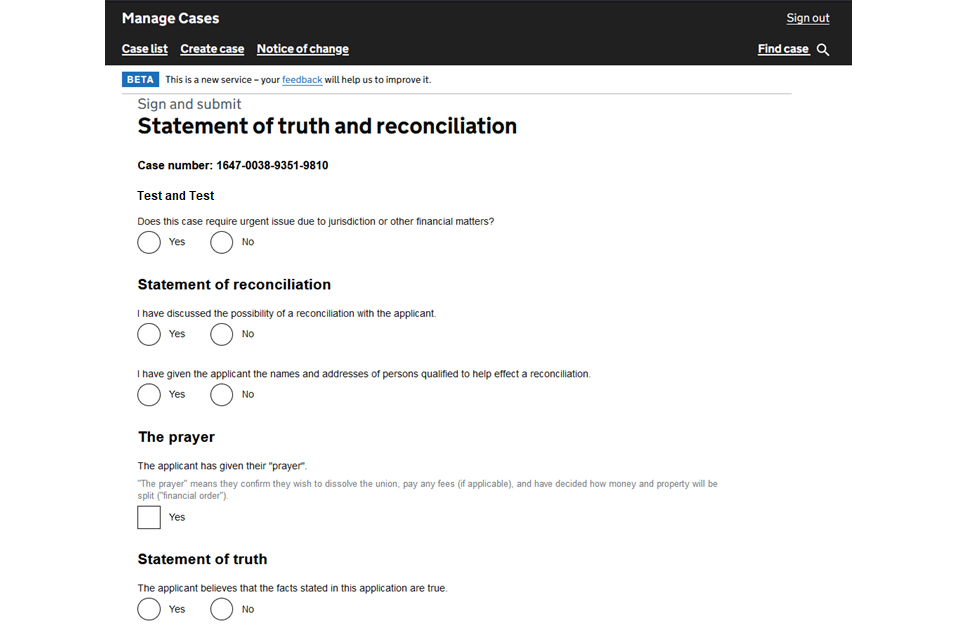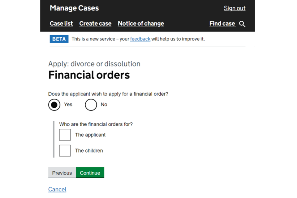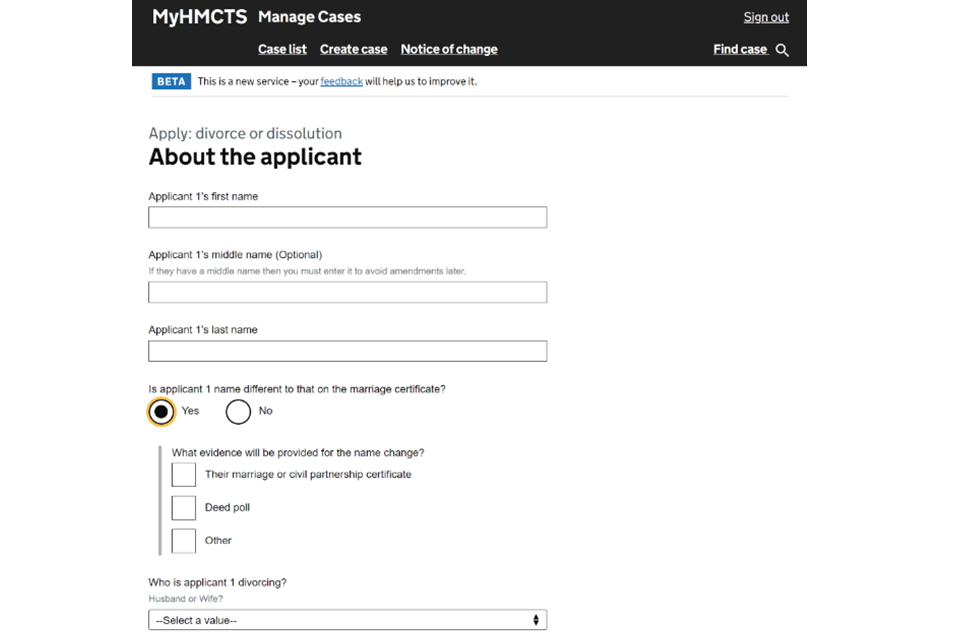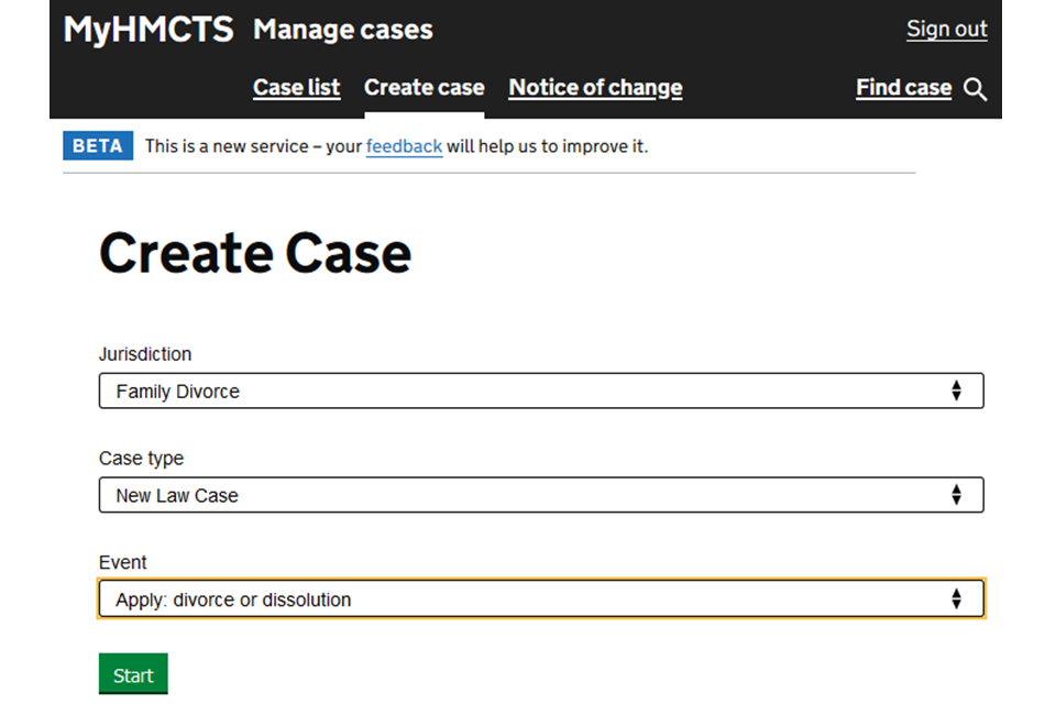 4. You will need to make sure you are in the correct case type for all new law divorce and dissolution by choosing ‘New Law case’.