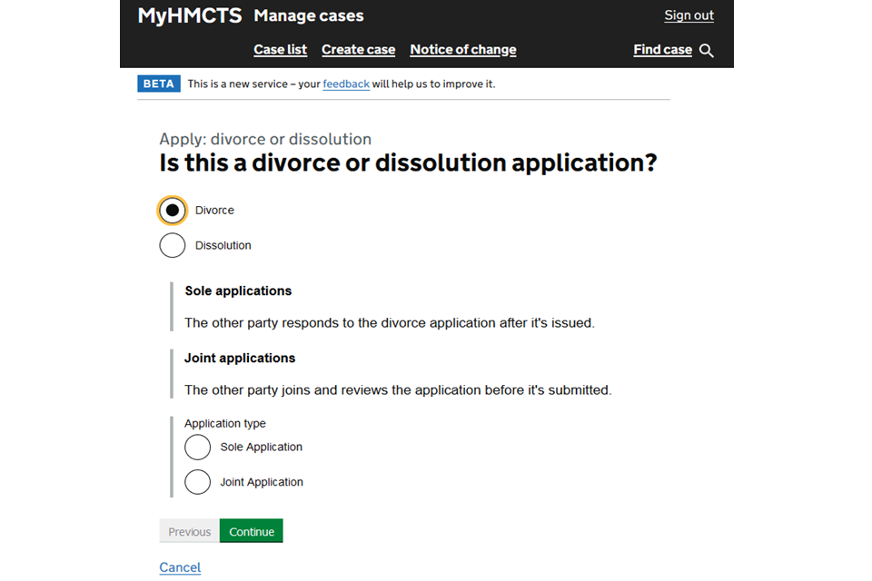 For divorce and dissolution of a civil partnership, you can apply using a sole application or a joint application. There is separate guidance on how to apply for sole applications. If you are a solicitor acting for both parties you will need to apply on paper.