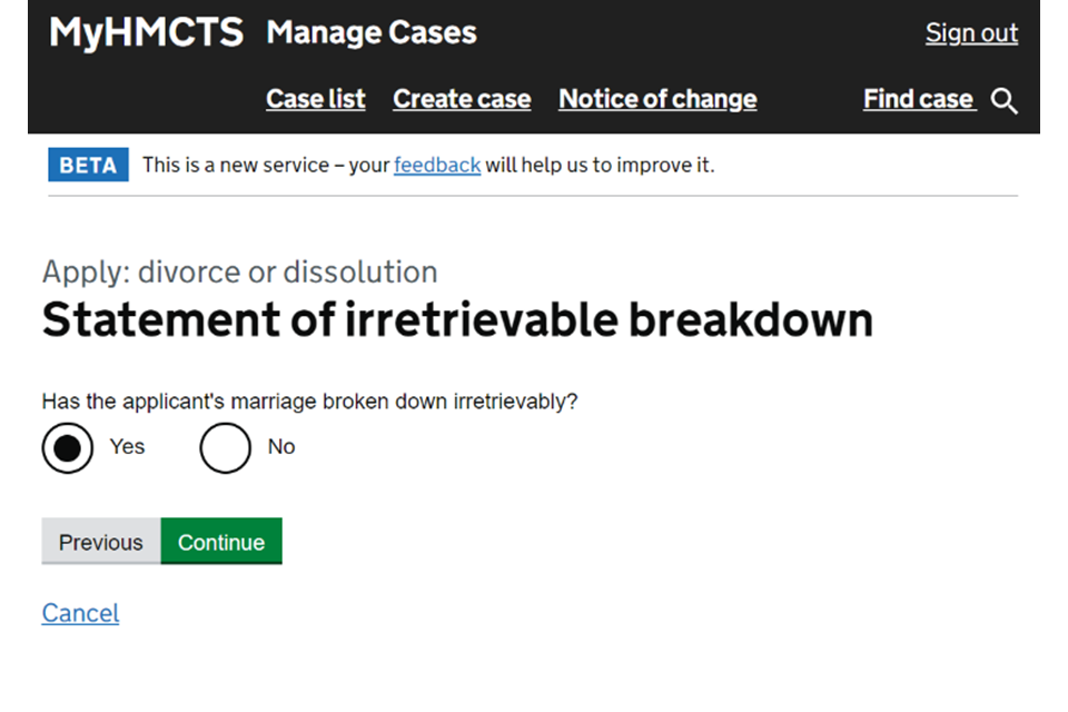1. Select ‘Yes’ or ‘No’ when asked ‘Has the applicant’s marriage broken down irretrievably’?