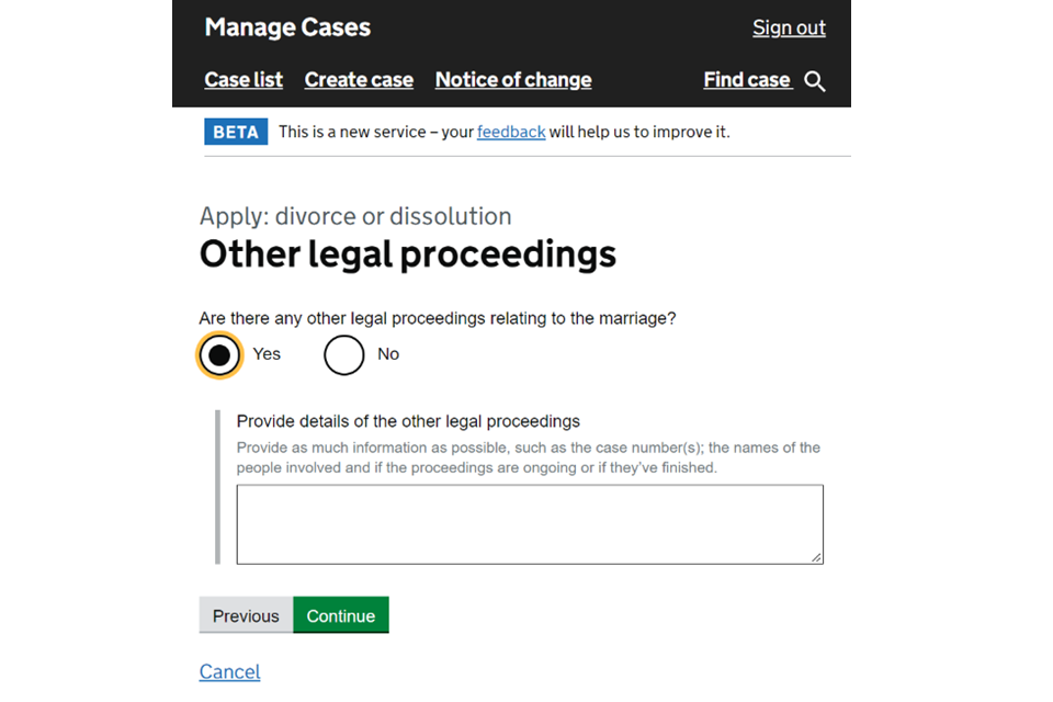 1. Select whether there are any existing or previous court proceedings relating to the divorce or dissolution.