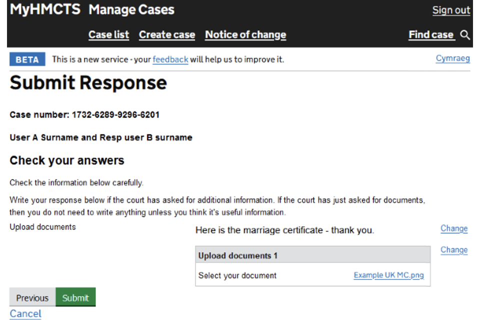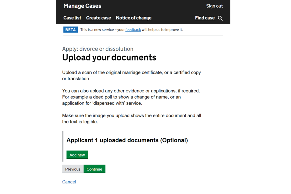 You should upload an image of the marriage or civil partnership certificate (you do not have to provide the original but this should be retained as it can be requested by a judge or legal adviser at any point). Make sure all 4 corners of the certificate can be seen in the image.
