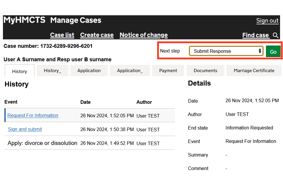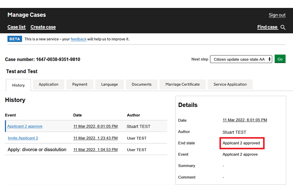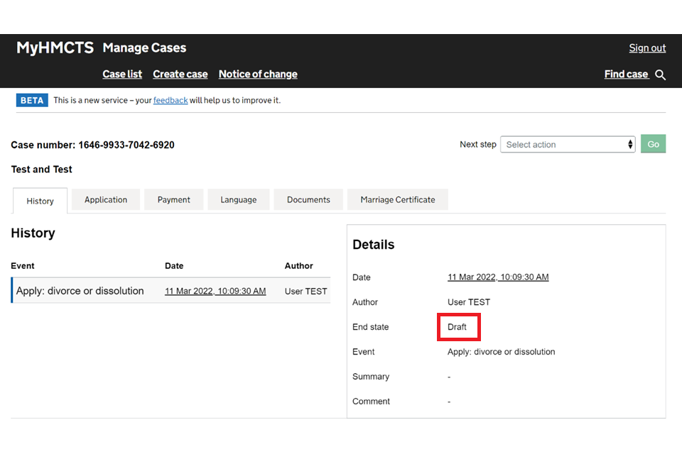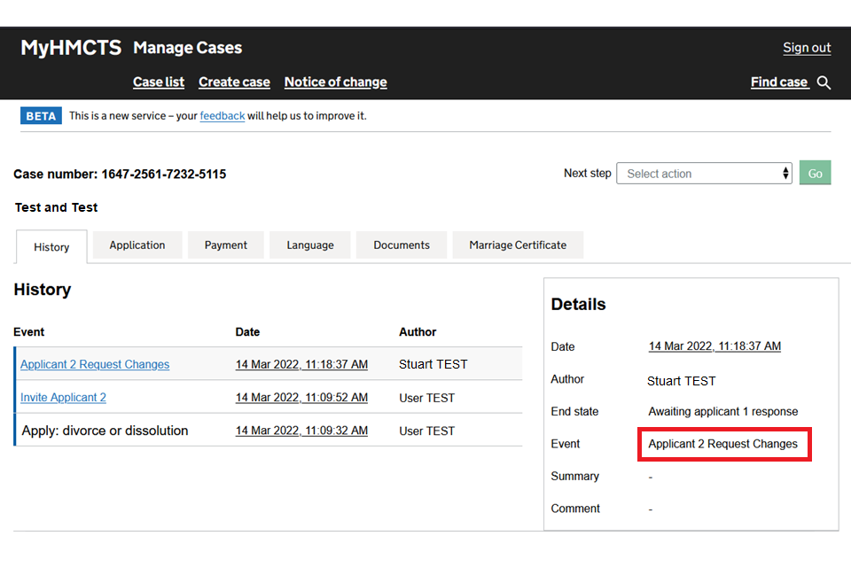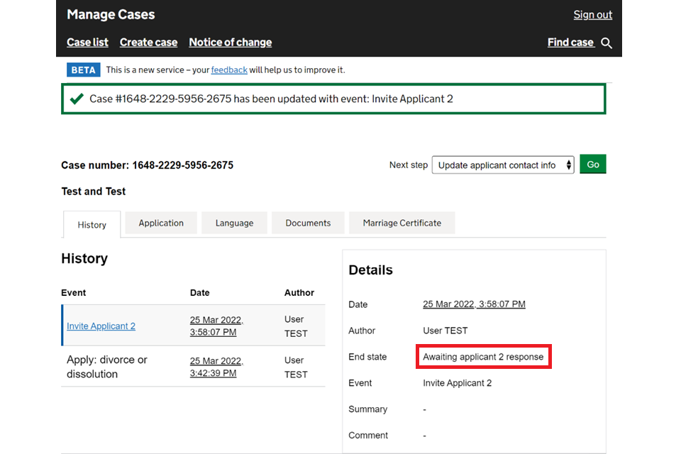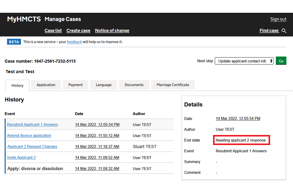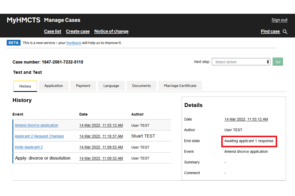 9. On the history screen it will have ‘Amend divorce application’ in the event and the ‘End state’ will be ‘Awaiting applicant 1 response’.