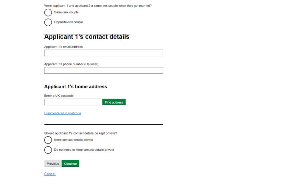 - applicant 1’s full name as it appears on the marriage or civil partnership certificate