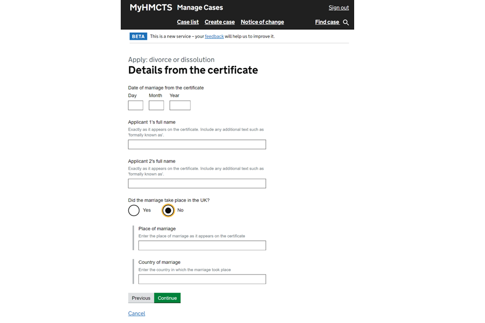 - whether the marriage or civil partnership took place within the UK – if it did not, you will need to provide country and place of marriage or civil partnership