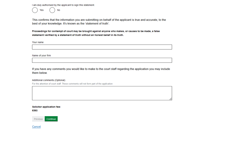 9. The section to request solicitor service is included in the statement of truth section of the application.