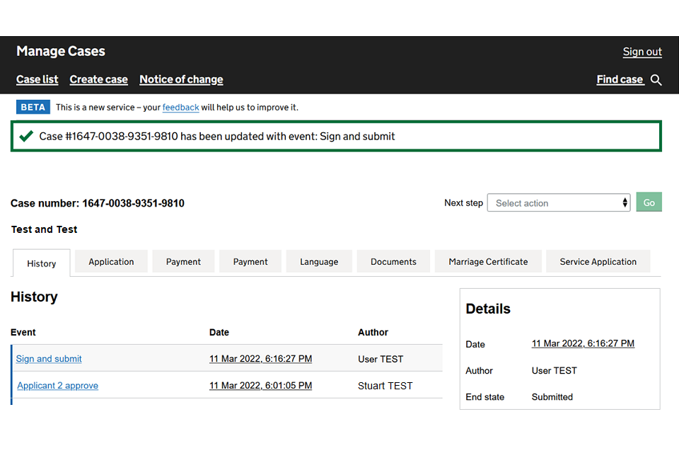 4. Once you have submitted a banner will appear at the top that says case has been updated with event sign and submit. The history screen is also updated. The case has now been submitted to the court.