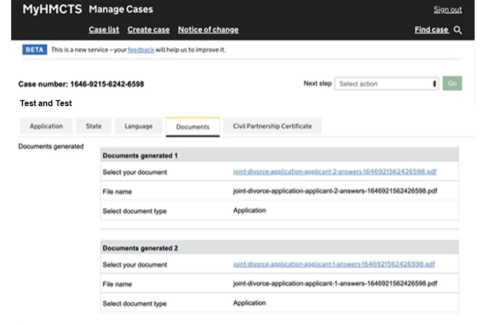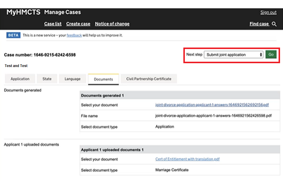 A notification is sent to applicant 1’s solicitor to confirm that you have approved the joint application. A new combined joint application D8 document will also be displayed on the documents tab with the details entered by both solicitors.