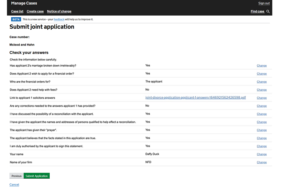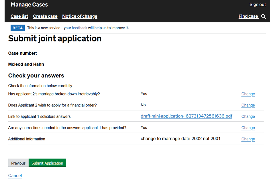 1. Once you have reviewed the full joint application and are content that all the details are correct select ‘Submit application’. It is at this point your application will be submitted to the Court and Tribunal Service Centre to be processed.