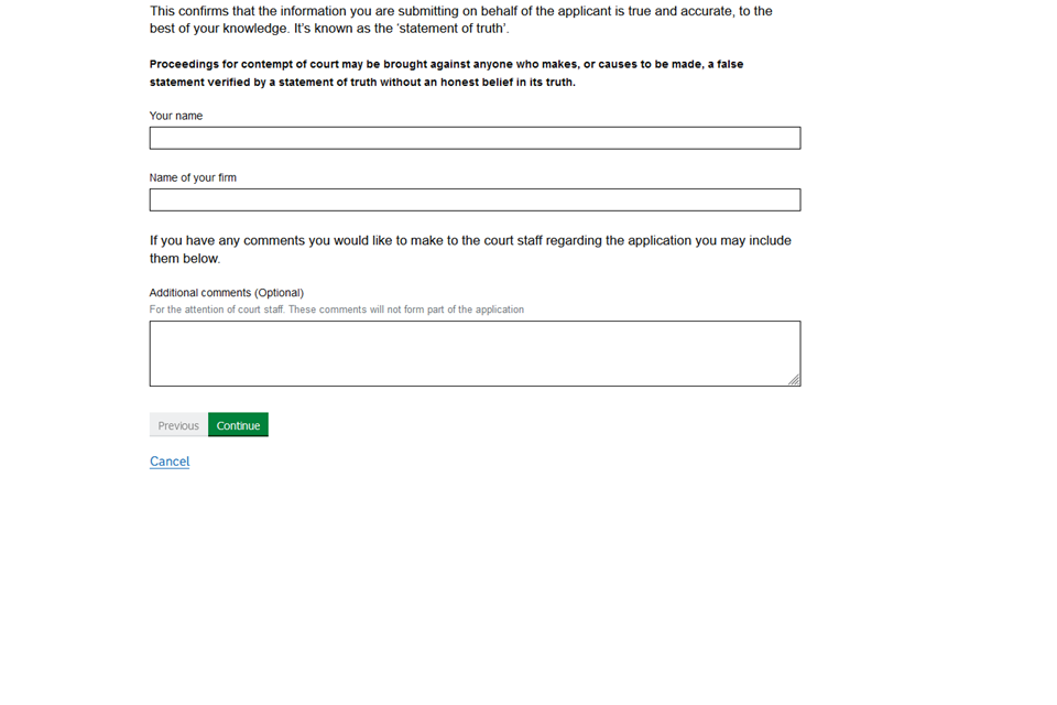 11. Any additional information for the court to take notice of can be added in a free text ‘additional comments’ box.