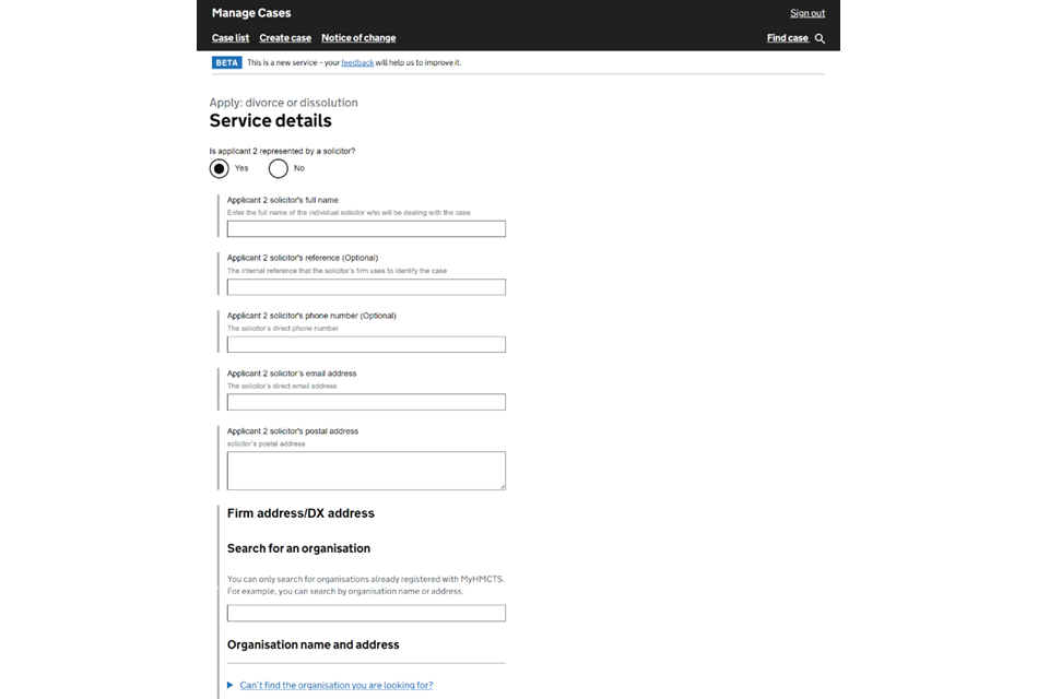 3. Within the search screen you can type in details of a specific case such as the divorce case number, party names and solicitor reference to find a specific case.
