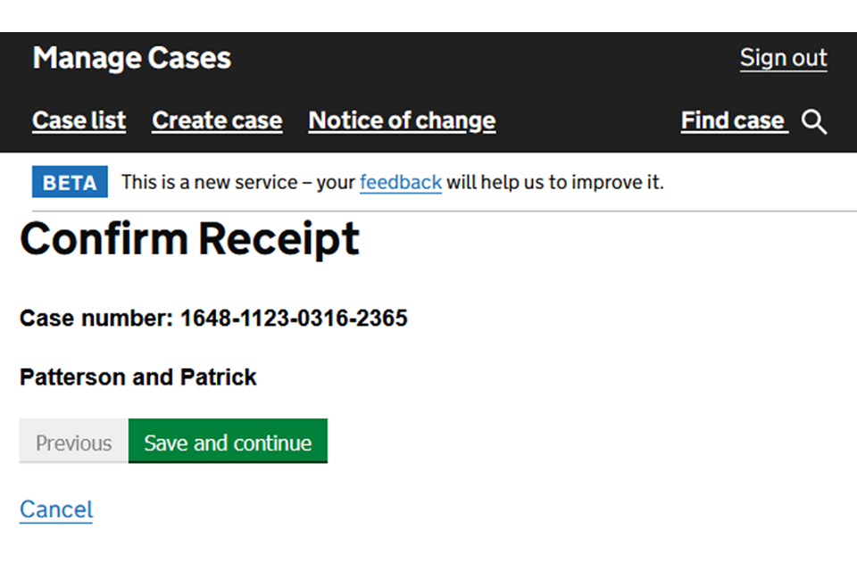 2. You can confirm receipt by selecting ‘Save and continue’, this will add the event ‘confirm receipt’ to the case.