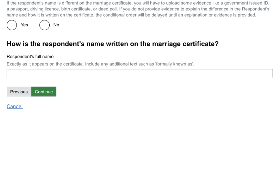 Select ‘No’ and enter the respondent’s full name exactly as it appears on the marriage certificate. Then select ‘Continue’.