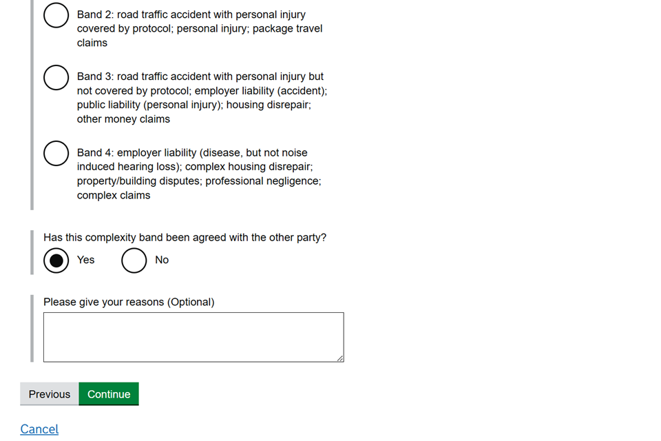 7. Select if the claim is subject to the fixed recoverable cost regime. If you select ‘No’ you can give your reasons. If you select ‘Yes’ you must then select which of the 4 complexity bands applies and whether it has been agreed with the other party. Provide any reasons for your answers and then select ‘Continue’.
